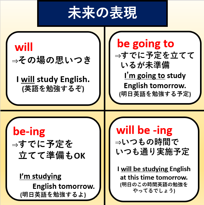 それ以外にもbe-ingやwill be-ingなど未来の表現があります。